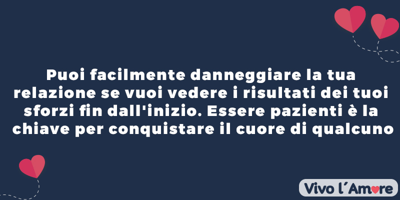 Puoi facilmente danneggiare la tua relazione se vuoi vedere i risultati dei tuoi sforzi fin dall'inizio. Essere pazienti è la chiave per conquistare il cuore di qualcuno.
