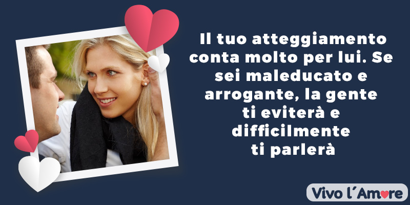 Il tuo atteggiamento conta molto per lui. Se sei maleducato e arrogante, la gente ti eviterà e difficilmente ti parlerà. Questo tipo di atteggiamento è considerato antisociale.